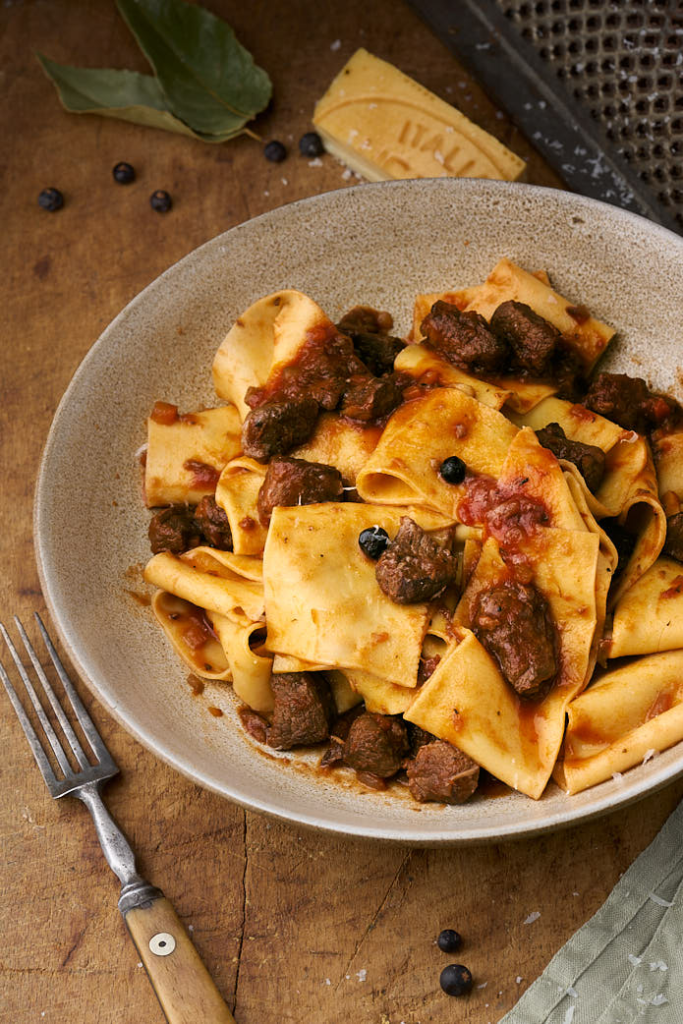 This Tuscan wild boar ragù (ragù di cinghiale) is a slow-cooked meat sauce made with wild boar, red wine, tomatoes, and juniper berries. The meat’s natural richness works well with long cooking, and the sauce develops a deep, structured flavour that pairs perfectly with fresh pappardelle. This dish has always been a staple dish in Tuscany and it continues to appear on menus throughout the region, especially in autumn and winter.